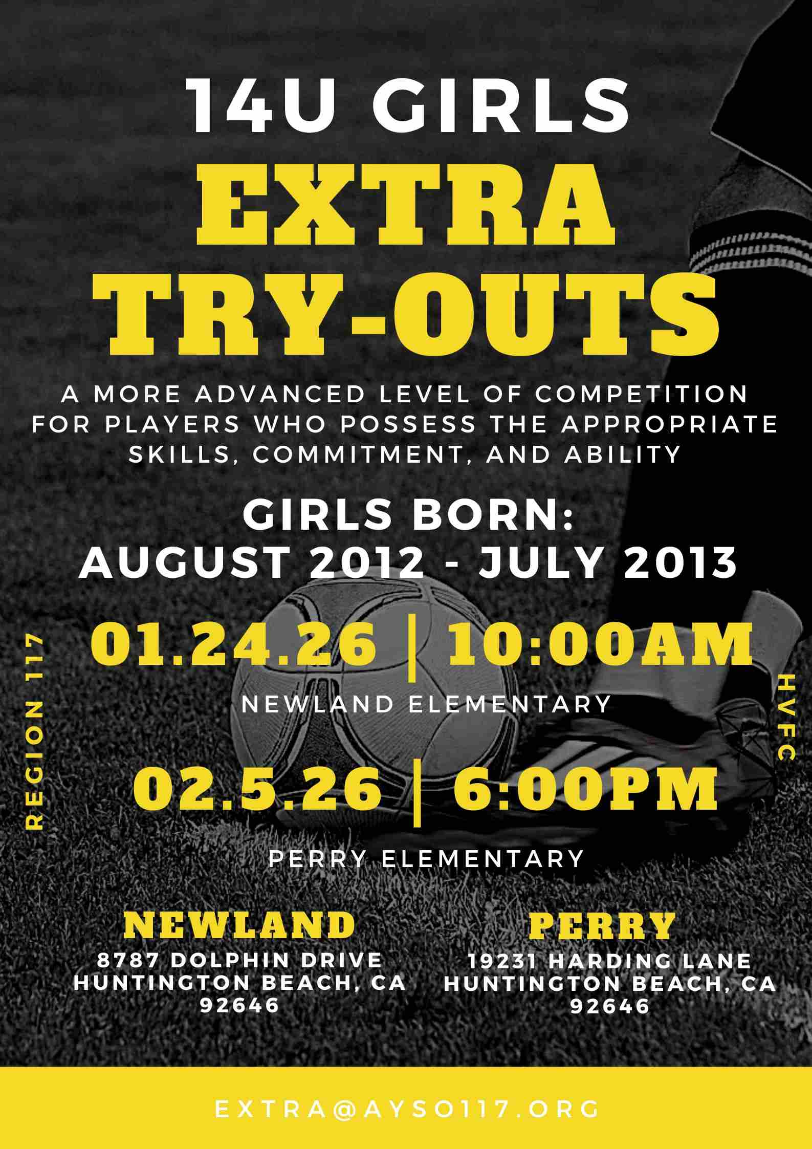 Players must try out each year and are open to all 09U-16U Boys & Girls. Players should attend both tryouts. Qualified players should try out even if they are not 100% sure they want to play EXTRA.